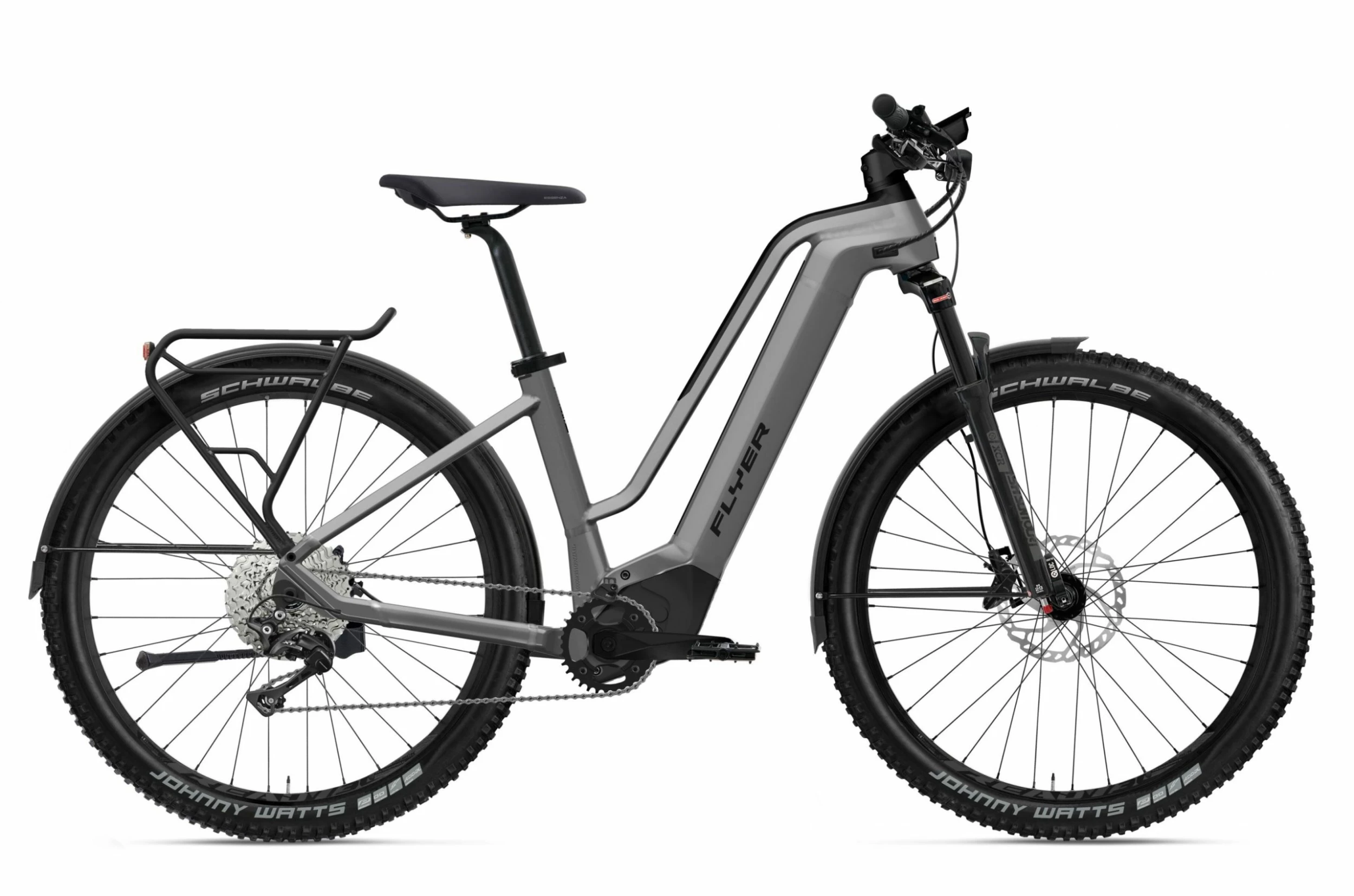 Le Flyer Goroc 2 6.30 2022 vous offrira une grande polyvalence et surtout beaucoup de puissance. Ce vélo électrique de randonnée s’appuie sur un tout nouveau cadre en aluminium avec tube de direction de 1,8 pouce qui assure une grande rigidité et une stabilité pour vos déplacements en ville ou sur les chemins. Une bonne partie du confort est aussi assurée par les pneus Schwalbe Johnny Watts 2,6 pouces qui chaussent des roues 29 pouces. Des qualités qui permettent à Flyer d’oser la comparaison avec les SUV automobiles.
